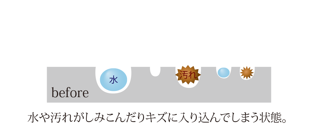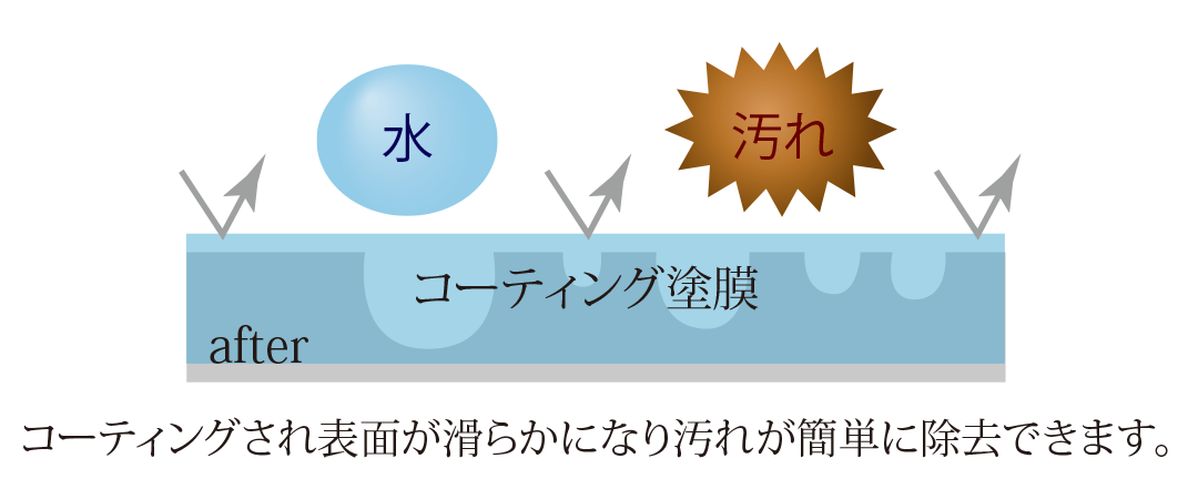 チタンと高純度シリカ化合物による塗膜が素材の目に見えない凹凸を埋め表面を滑らかにコーティングする事により汚れがつきにくく、落としやすくなります。